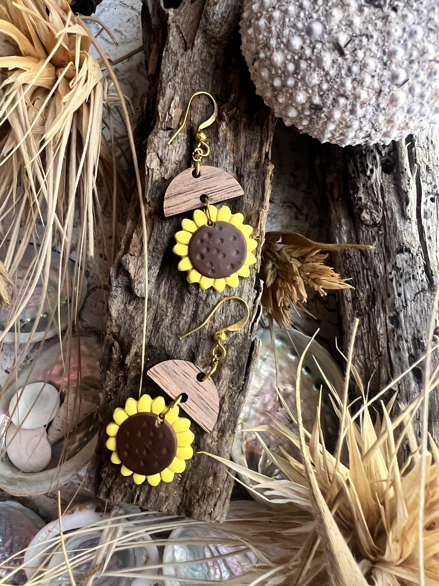 Sun kissed and playful , these polymer clay sunflower earrings capture the golden glow of summer. lovingly handmade , each pair sparks joy , warmth and a touch of delight , inviting your spirit to bloom and dance in the sunlight , carrying happiness and wonder wherever you go.